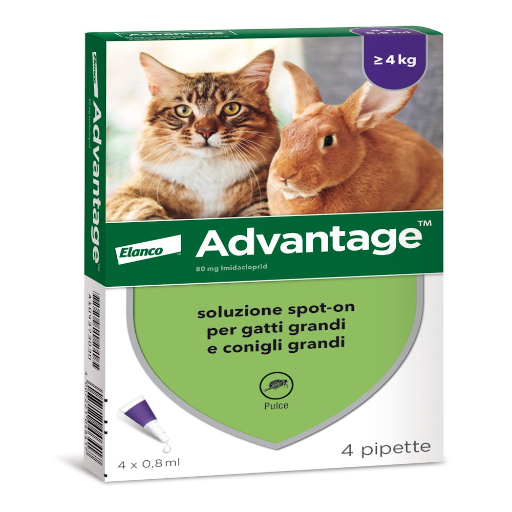 Advantage Antiparassitario Spot-On per Gatti e Conigli superiori a 4 kgย รจ un efficace antiparassitario in pipette per la prevenzione e trattamento delle pulci nei gatti di peso superiori ai 4 kg. Questo particolare antiparassitario in fiale da 0,8 ml, contiene imidacloprid, butilidrossitoluene e previene lโulteriore infestazione da pulci per 3-4 settimane. Prodotto distribuito da Elanco.