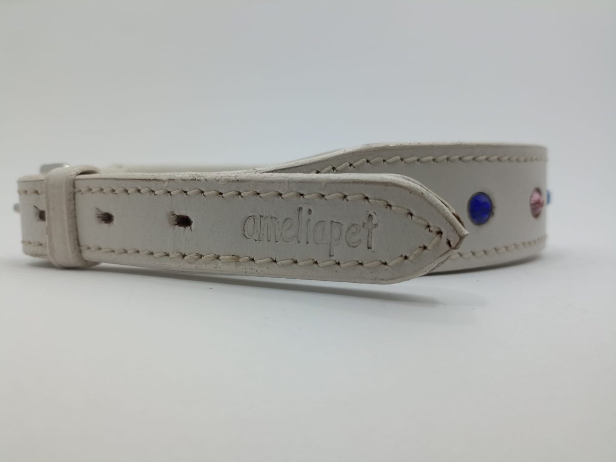 Caratterizzato da un design in cuoio pregiato, il Collare Brilliance Amelia Pet con Strass pesenta uno straordinario dettaglio: strass colorati incastonati lungo la lunghezza, che aggiungono un tocco di brillantezza e raffinatezza al collare. Ogni strass è posizionato con cura e precisione per garantire un aspetto impeccabile e una durata nel tempo.