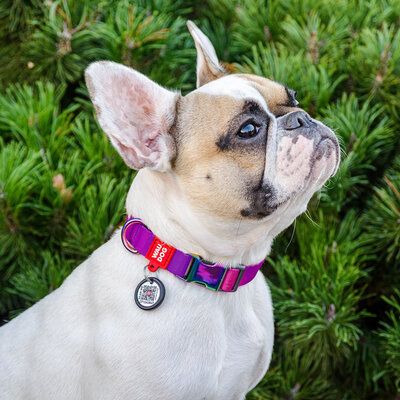 Collare in Nylon riciclato con fibbia cangiante. Taglie: M: circonferenza 24 – 40 cm, spessore 2 cm L: circonferenza 31 – 49 cm, spessore 2,5 cm