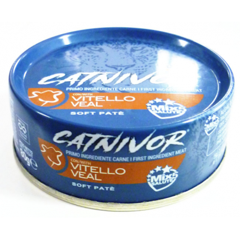 DRN Catnivor Soft Patè per Gatto Adulto Gusto Vitello 80 gr è un cibo umido per gatti con la carne come ingrediente base. Le proteine sono alla base dell’alimentazione del gatto, e la carne è l’ingrediente presente in maggiore quantità in queste scatolette per gatti, l’ideale per soddisfare i fabbisogni nutrizionali di un carnivoro stretto.