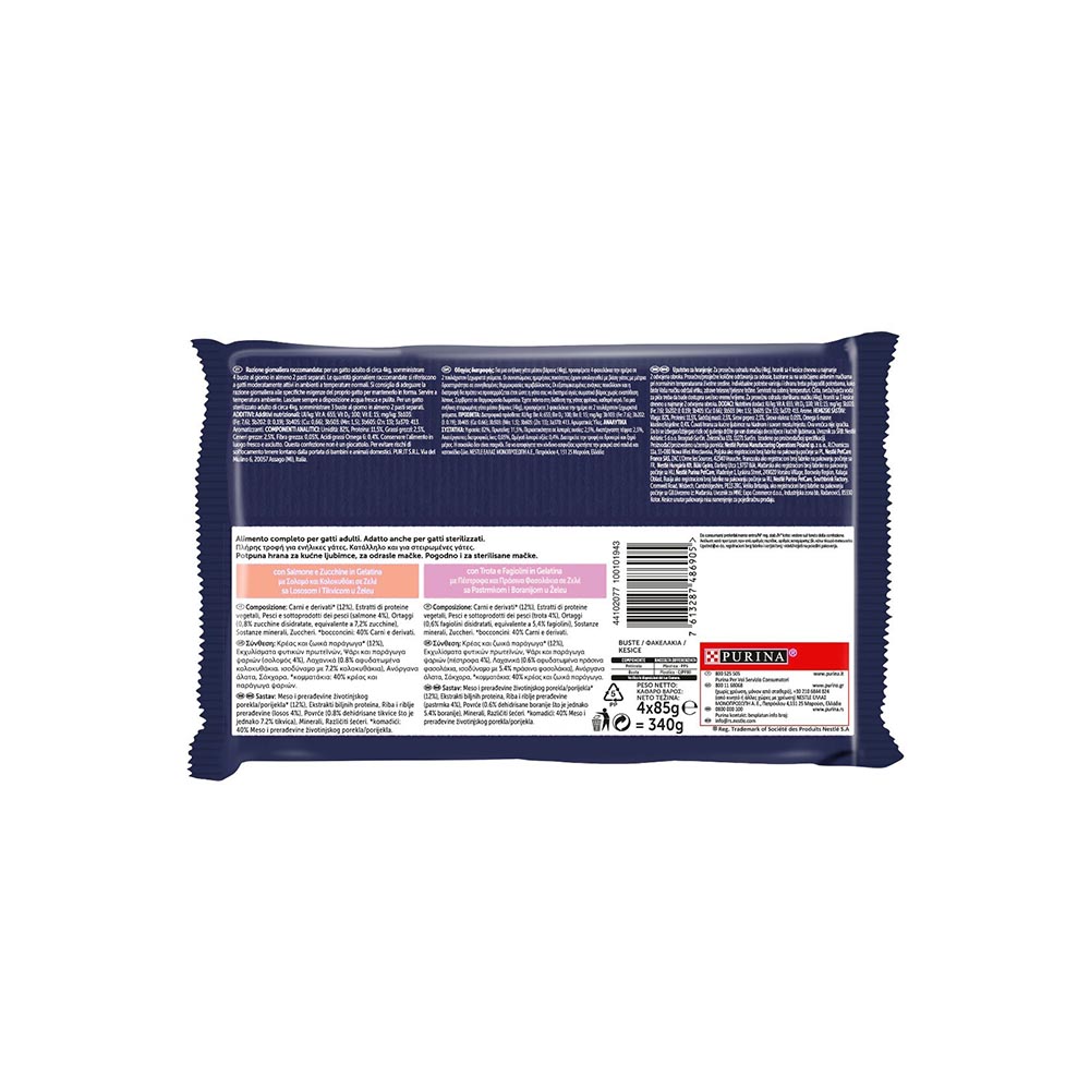 Composizione: Carni e derivati* (12%), Estratti di proteine vegetali, Pesci e sottoprodotti dei pesci (trota 4%), Ortaggi (0,6% fagiolini disidratati, equivalente a 5,4% fagiolini), Sostanze minerali, Zuccheri. *bocconcini: 40% Carni e derivati. Composizione: Carni e derivati* (12%), Estratti di proteine vegetali, Pesci e sottoprodotti dei pesci (salmone 4%), Ortaggi (0,8% zucchine disidratate, equivalente a 7,2% zucchine), Sostanze minerali, Zuccheri. *bocconcini: 40% Carni e derivati.