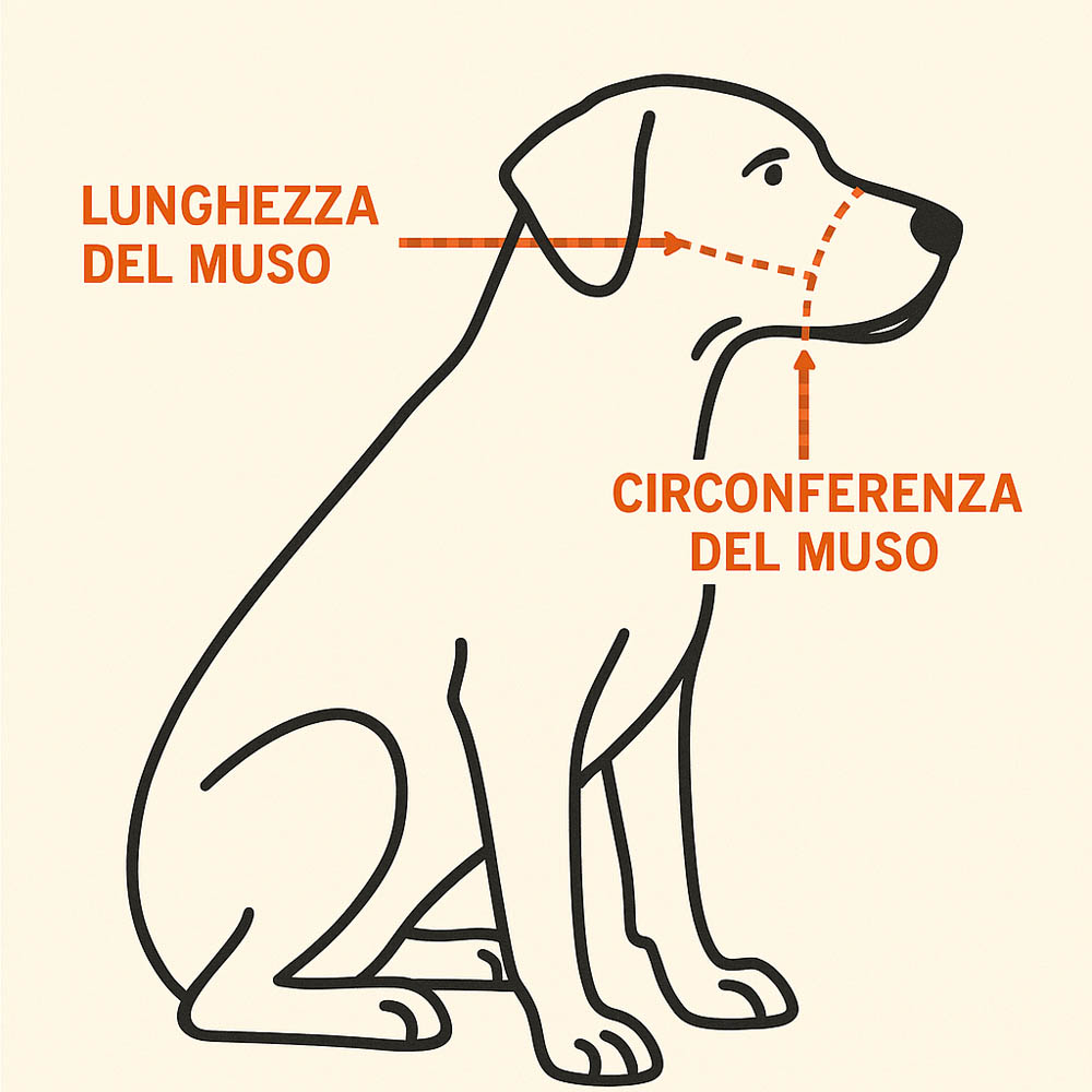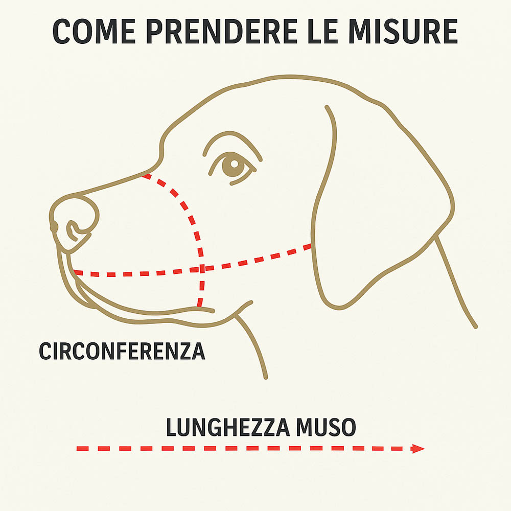| Taglia | Misure (Lunghezza muso x Circonferenza x Regolazione max) |