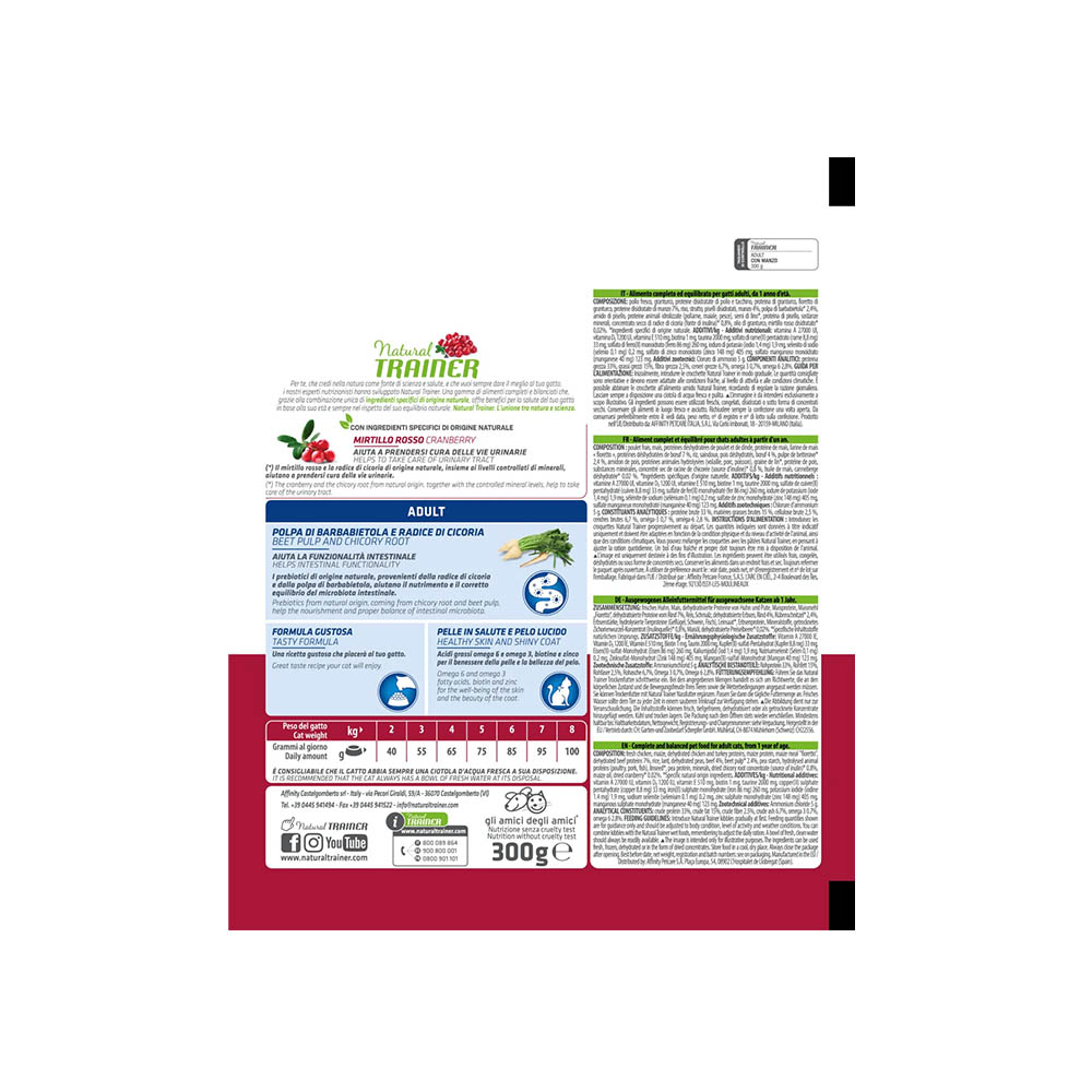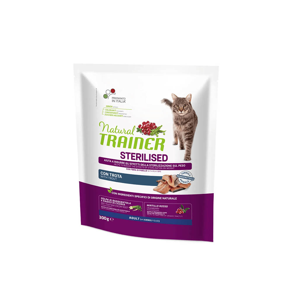Natural Trainer STERILISED ADULT TROTA 300g è disponibile nel pratico formato da 300g, ideale per chi desidera testare il prodotto o per gatti con consumo moderato. È la scelta perfetta per chi cerca un’alimentazione naturale, gustosa e specificamente studiata per i gatti sterilizzati.