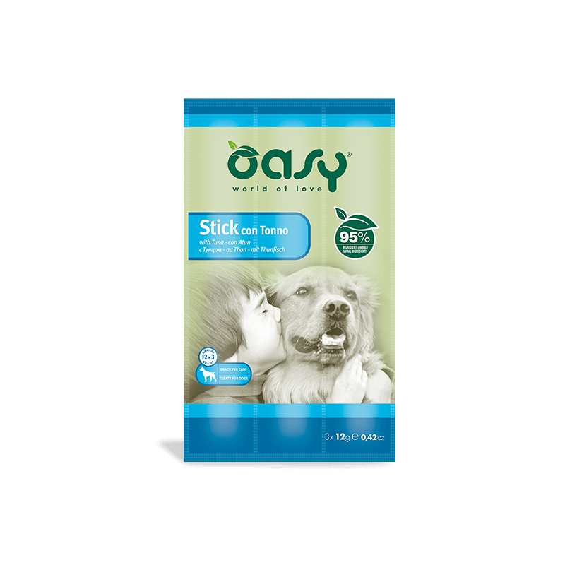Oasy Stick per Cane Gusto Tonno (3x12gr) è un alimento complementare per cani indicato per Cani di tutte le età e taglie al gusto pollo, questo prodotto è disponibile nel formato 3 x 12 g.