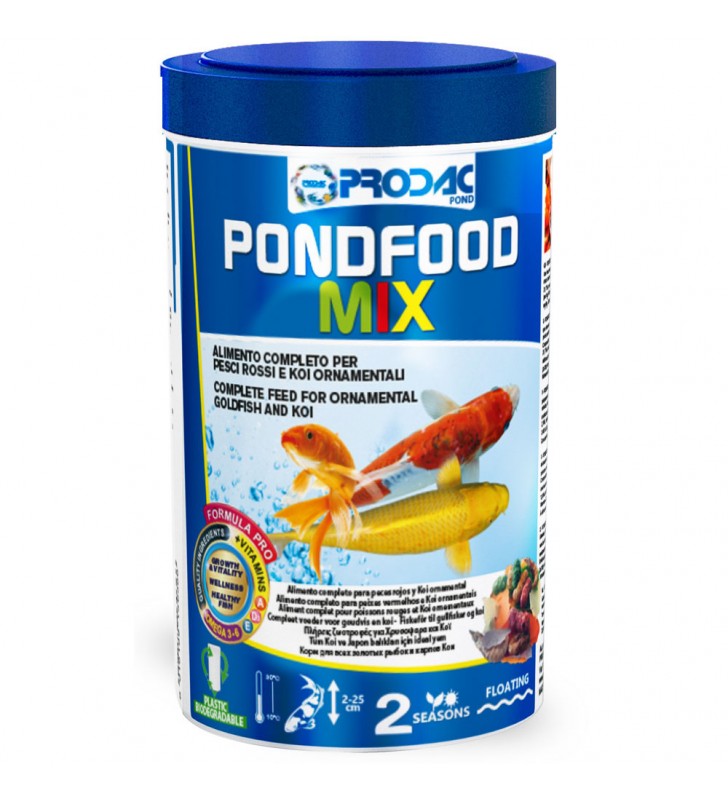PRODAC PONDFOOD MANGIME MISTO PER PESCE DA LAGHETTO 150GR Mangime completo in scaglie, bastoncini e gamberetti per pesci di piccola e media taglia che vivono in stagni ornamentali. 150g