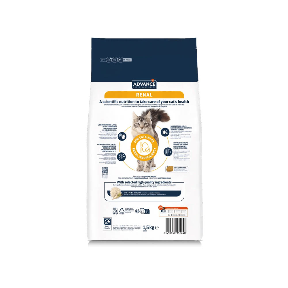 RENAL GATTO ADVANCE 1,5Kg è un alimento dietetico completo per gatti adulti, formulato per supportare la funzione renale in caso di insufficienza cronica. Grazie al contenuto ridotto di fosforo e proteine di alta qualità, contribuisce a rallentare la progressione della malattia e a mantenere la massa muscolare. L’apporto bilanciato di acidi grassi omega-3 favorisce la protezione renale, mentre la sua composizione altamente digeribile garantisce un’assimilazione ottimale dei nutrienti. È clinicamente testato e sviluppato per offrire un’alimentazione sicura, appetibile e bilanciata, migliorando la qualità di vita del gatto con problemi renali.