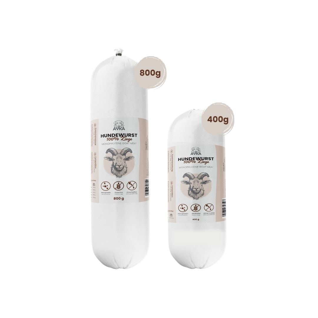 Rotolo di carne di capra (97%) Perfetto da tagliare a pezzettini ed utilizzare come premio durante l’addestramento. Non si sbriciola e rimane intatto. 100% senza glutine 100% senza cereali 100% senza zucchero Monoproteico Senza conservanti Senza aromi, coloranti o additivi artificiali Composizione: 97% carne di capra e 3% tapioca Componenti analitici: Umidità 67,8% Proteine grezze 8,6% Grassi grezzi 11,5% Fibra grezza <0,3% Ceneri grezze 1,8% Il prodotto ideale per ogni situazione: che si tratti di addestramento, come pasto in vacanza o come integratore BARF, le salsicce per cani AYKA sono versatili.