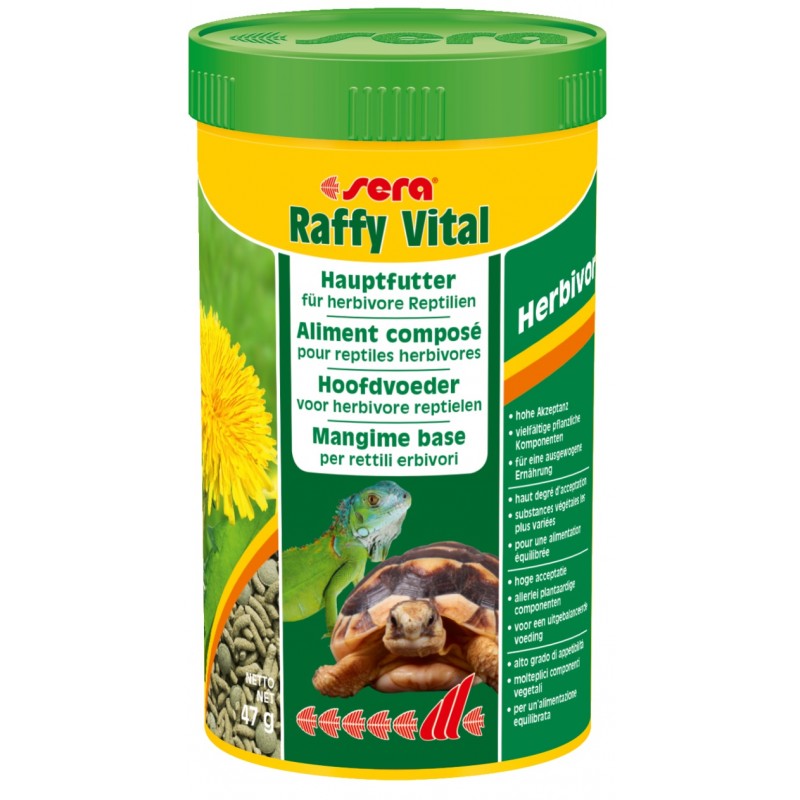 Sera Raffy Vital è il mangime base composto da sticks e pastiglie vegetali, prodotti in modo delicato, per tartarughe terrestri e per tutti gli altri rettili erbivori. 47g