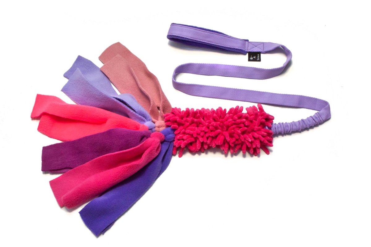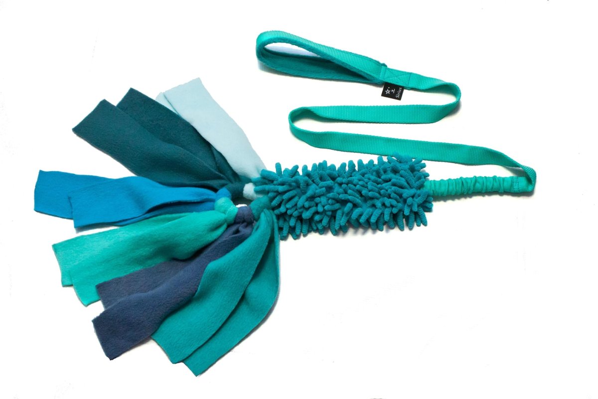 gioco disponibile con maniglia bungee lunga o corta. parte centrale in mop colorato molto morbido. Parte finale in tentacoli di pile per stimolare la predazione del nostro cane. adatto ver3amente a tutti! adulti e cuccioli.