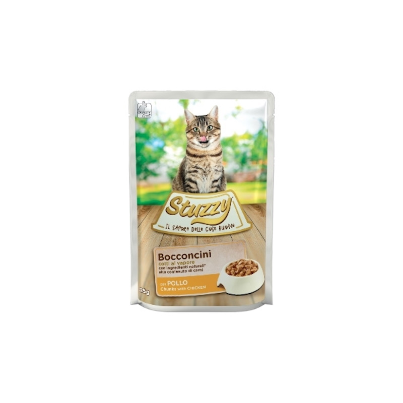 Stuzzy Cat Bocconcini In Salsa per Gatto Adulto Gusto Pollo 85 gr sono pratiche bustine salvafreschezza, contenenti deliziosi bocconcini di carne ideali per il tuo gatto. Buoni, semplici e nutrienti, diventeranno i suoi preferiti. Una ricetta completa e bilanciata, preparata con cura utilizzando ingredienti naturali e la cottura al vapore. Il gusto semplice del pollo è tutta la genuinità di ingredienti naturali cotti al vapore: i Bocconcini con Pollo di Stuzzy sono la ricetta completa che conquisterà il tuo gatto. Da leccarsi i baffi!