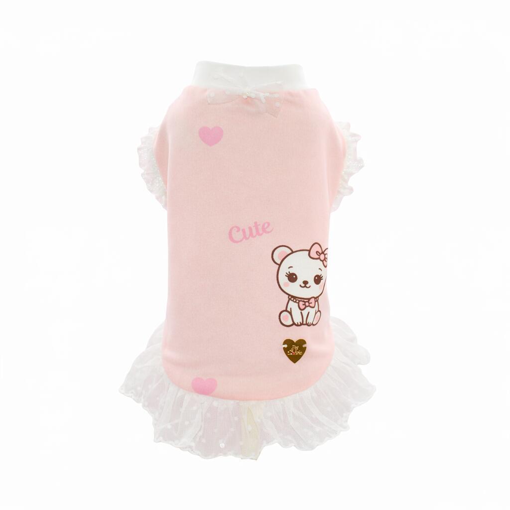 La stampa raffigura una tenera orsetta romantica accompagnata da piccoli cuori e dalla scritta “Cute”, creando un universo delicato e sognante, perfetto per un look femminile e curato.