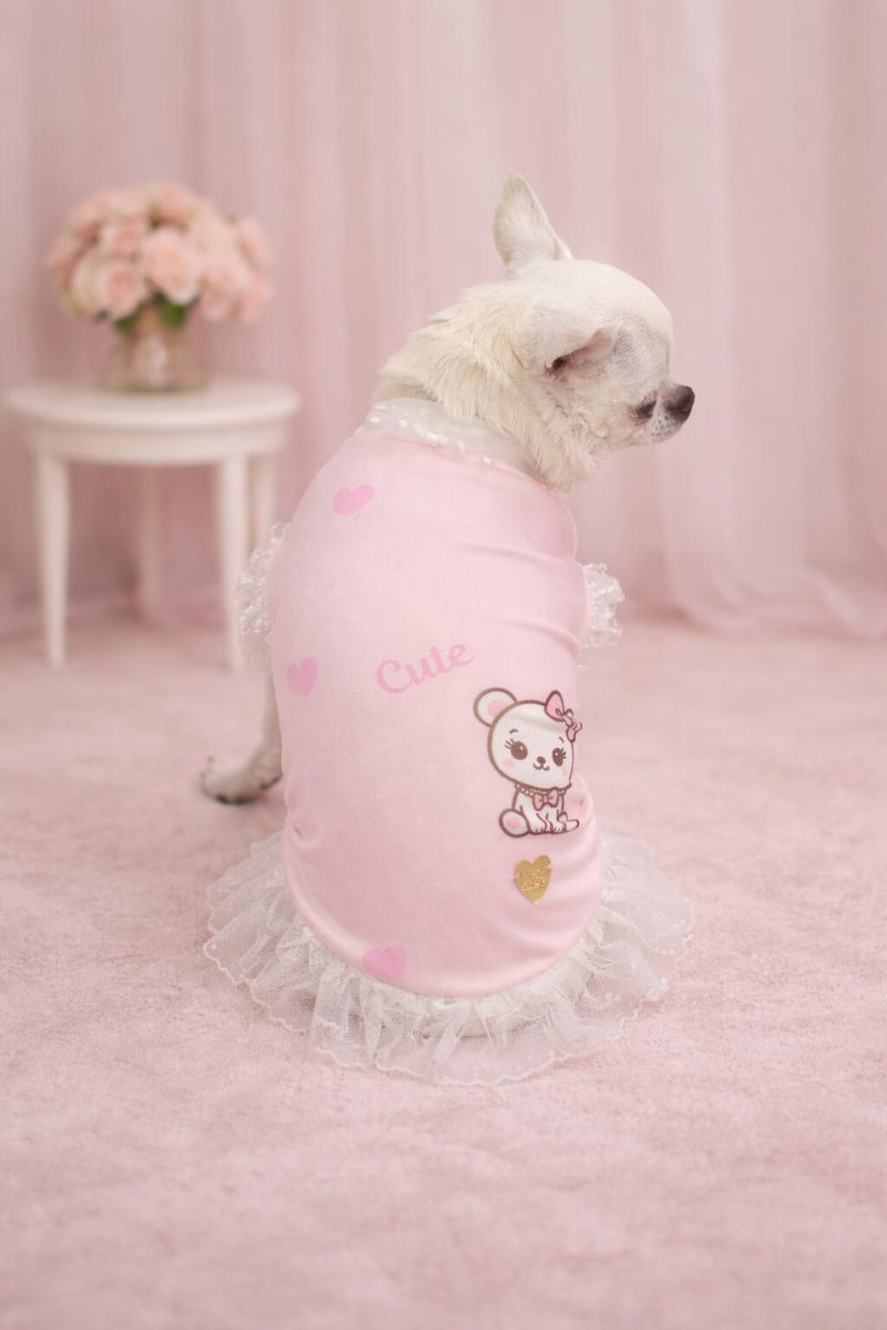 Cute Blushing T-Shirt è una t shirt per cani estiva dal design romantico e raffinato, pensata per vestire il tuo cane con eleganza e dolcezza durante la stagione più calda. La stampa raffigura una tenera orsetta romantica accompagnata da piccoli cuori e dalla scritta “Cute”, creando un universo delicato e sognante, perfetto per un look femminile e curato. Realizzata in tessuto jersey mano pesca, è estremamente morbida al tatto, leggera, elastica e traspirante, ideale per garantire comfort e freschezza nelle giornate estive. Il design è impreziosito da un pizzo in tulle a pois e da un fiocchetto in tulle, dettagli…