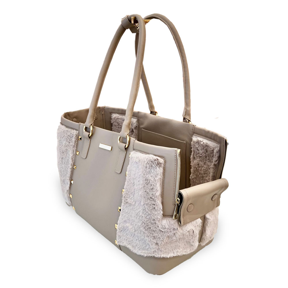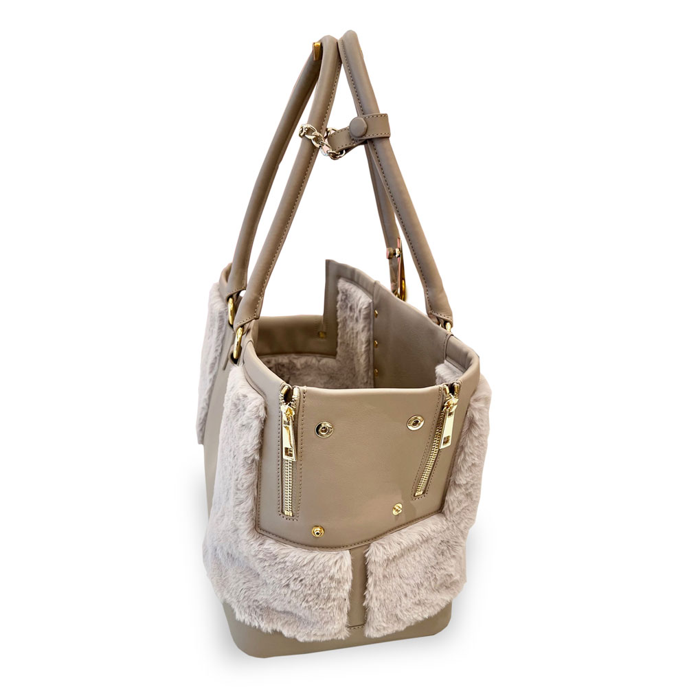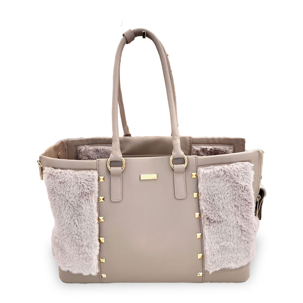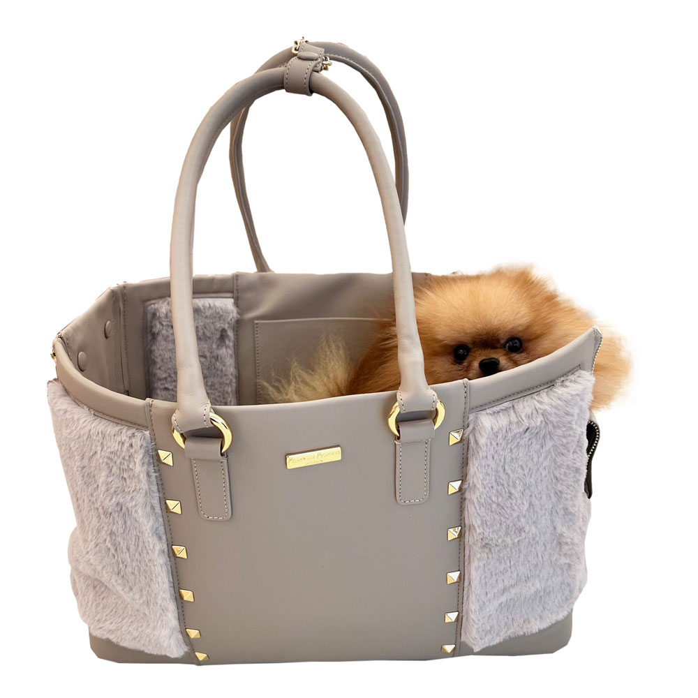 The new Spider Bag by Prince and Princess is incredibly refined! Perfect for strolling around the city, going to the restaurant, and for any occasion. Extremely elegant, made from high-quality leather and adorned with golden studs and faux fur. The removable and washable cushion is made from very soft shaved faux fur. It features a side adjustable nose rest, with a double internal safety hook, making it suitable for two small dogs. Material: LEATHER / FAUX FUR Dimensions (cm): 40×27×19 (Width x Height x Depth)